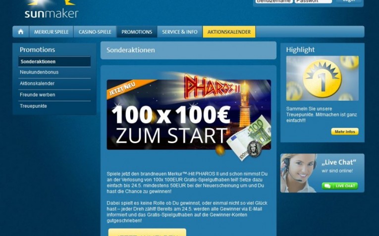 Besonders interessant war an dieser Stelle, dass keine Software heruntergeladen werden musste. Die sehr gute Qualität des Flash-Casinos überzeugt dabei schlechthin. Dabei kann der Kunde Treuepunkte sammeln, die die Form von Sonnen haben. Wenn 100 Sonnen gesammelt wurden, können damit 1 Euro verdient werden. Ein attraktives Treueprogramm, welches sich wirklich sehen lassen kann. Auch als Handy Casino hatt sich Sunmaker verbessert, lesen sie hierzu den Testbericht zum Merkur Spiele App.